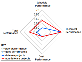 We found that--when examining budget, schedule, and requirements satisfaction--performance against budget and technical requirements was the same in both defense and non-defense domains. With respect to schedule, however, non-defense projects performed somewhat better than did defense projects.
