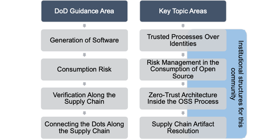 The DoD memorandum on open source software represents an excellent balance between the potential and opportunity of open source software and the understandable concerns about security and supply chain dependencies. Participants agreed that the Adopt, Buy, Create guidance and the open by default posture are appropriate, and recognized that security and supply chain issues are best addressed through risk management. Moreover, participants recognized that the SBOM is a key aspect (though not sufficient) for security and supply chain management. The participants also agreed that tools and techniques that assess the trustworthiness of the development processes of open source projects are appropriate, as opposed to methods that focus on tracking open source contributions from individuals, companies, or nations in a blanket manner. The participants identified several specific ideas that could support such an approach. We welcome the opportunity to partner with other federal agencies who could align to efforts in accordance with DoD leadership, particularly those efforts related to the memo that characterizes relevant issues from both the consumer and the producer perspectives.