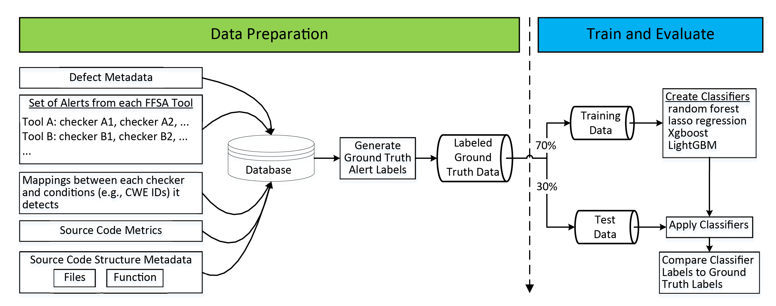 Obtaining relevant training data is the first ingredient to develop any machine learning-based classifier. Ideal data in this case would include a large number of FFSA alerts with expert labels specifying whether each alert is a false positive. Unfortunately, publicly-available data of this type is scarce. An organization that wishes to use a SAAC to maintain its code base must apply internal expertise to label alerts, which increases the start-up cost of using a SAAC and ultimately reduces the value of a SAAC for smaller organizations that do not have much internal data.