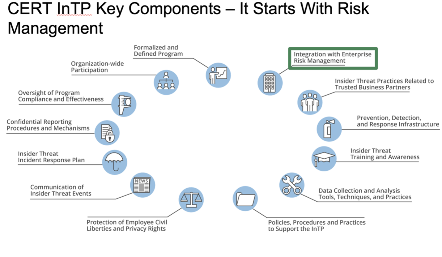 - Integration with Enterprise Risk Management—The IRMP must ensure that all aspects of the organization’s risk management include insider threat considerations (not just outside attackers), and the organization should consider establishing a standalone component for insider risk management.
