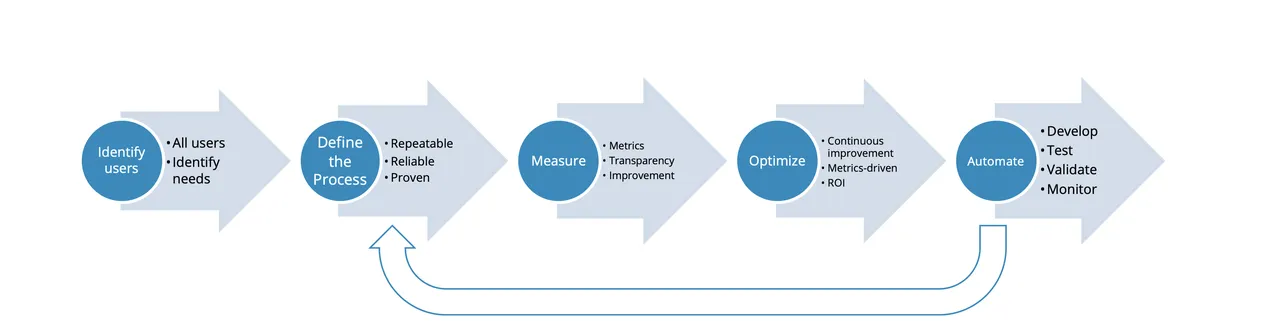 - Define the process. Document a reliable and repeatable set of steps, develop checklists, and use a service desk or ticketing system to implement a simple workflow to capture instances of the process, their progress, and issues relating to them. No automation is required here, but it is important to ensure that the process is executed the same every time and a system for capturing metrics is in place.