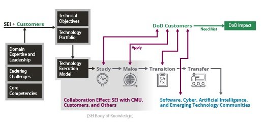 To achieve these objectives, we close the loop between research and practice. The SEI facilitates the transition of research results to practice in DoD programs and OSD Science & Technology (S&T) initiatives and the transfer of those results to non-DoD U.S. government organizations where improvements will also benefit the DoD. By doing so, we gain deeper insight into mission needs that forms the basis for new research. In addition, we transition matured technologies more broadly to Defense Industrial Base organizations and others in the DoD software supply chain. Figure 1 highlights our primary technical activities: applied research and development (AR&D), engagement in the field, and transition.