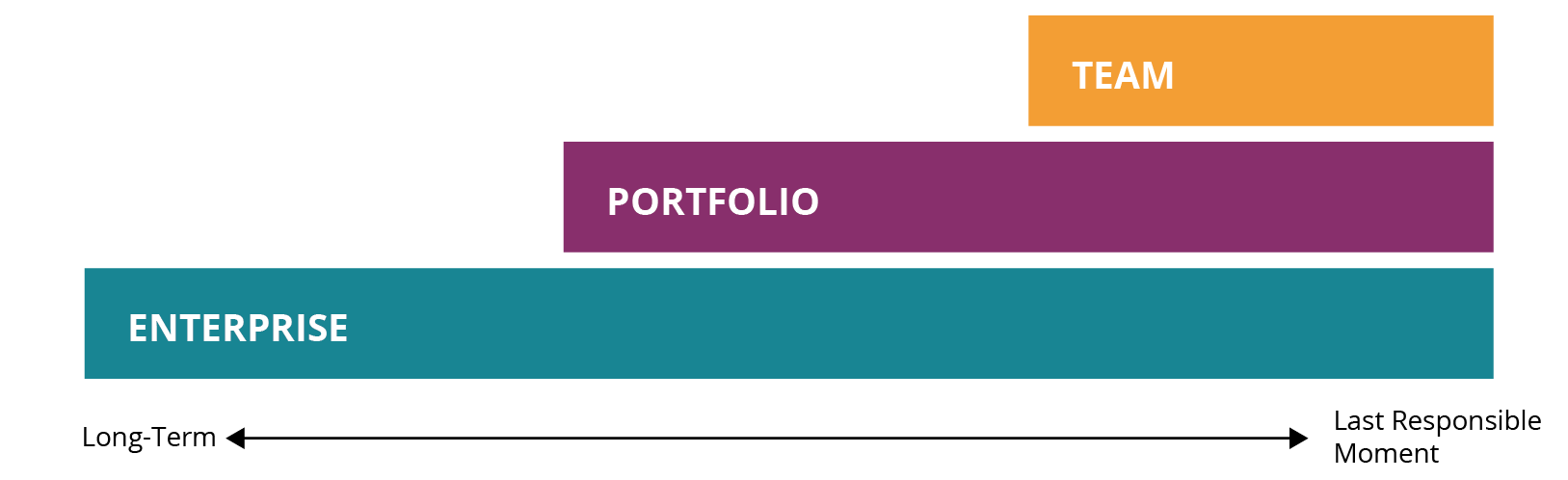 As is usually the case, the optimal approach lies somewhere in between, and it is situational. In general, the larger the audience or the higher up in the organizational hierarchy that the decision directly affects, the sooner the decision and planning should be performed. Often this situation means that enterprise-wide planning happens before portfolio planning, and portfolio planning happens before team planning. This approach is particularly relevant with architectural planning decisions. For instance, in systems of systems, the architectural plan and vision must be sufficiently defined up front to enable teams to build compatible work. Things like communication protocols, operating systems, and timing, which affect the entire enterprise, are best determined up front. But architectural decisions that affect only a single team should be deferred until later to exploit potential tradeoffs before being documented and implemented.