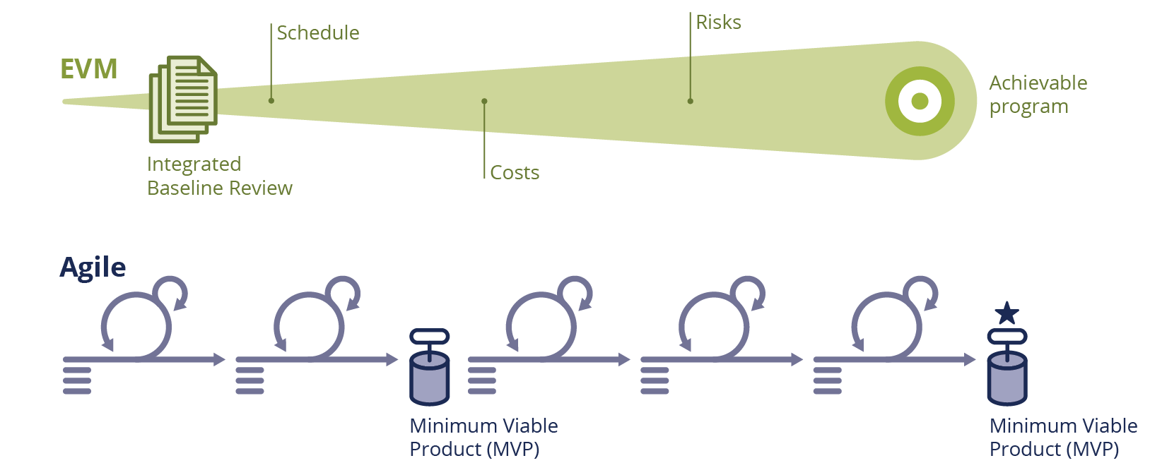 The two approaches are compatible with each other. For large programs that will use both Agile methods and EVM, it is likely that an IBR will be conducted as usual, though it should be considered that a part of the IBR might include a demonstration of an MVP (if it can be developed in time). Regardless of the presence of an MVP, the following questions should be answered no later than the IBR: