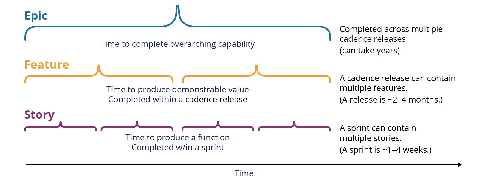 An Agile program’s development work is broken down into hierarchical categories based on their ontology. Typically, the highest levels of work, often called epics, will be the overarching capabilities or requirements that can take years to complete. The program will then break down that higher level work into smaller, more defined pieces that fit within the different timeboxed cadence releases and iterations. A commonly prescribed hierarchy would be to have epics at the top, then features, and finally stories at the lowest level.