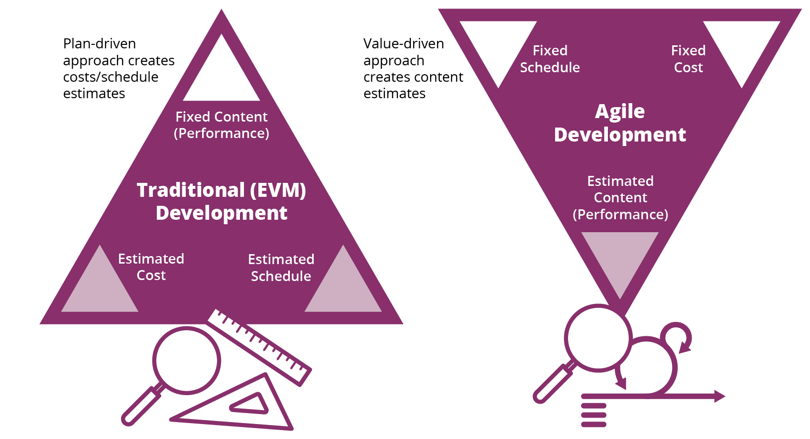 - Agile inverts this PM triangle because it utilizes cadence-based planning instead of the capability-based planning used by EVM. The iterative and fixed timeboxes that Agile employs to develop the system being acquired welcome evolutionary changes in the system’s performance because learning is expected over time. With Agile, cost and schedule are relatively fixed within the iterative timeboxes, and the solution that emerges is assessed for value.