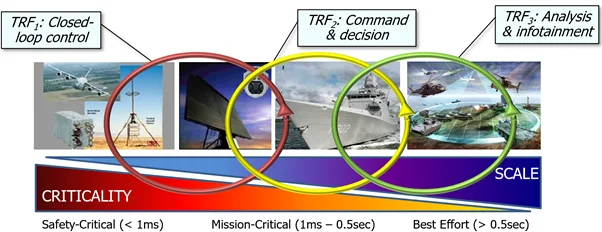 Figure 1 shows that in complex systems of systems, functionality coexists with a range of technology domains, with different levels of criticality, different levels of latency, and different scale factors with respect to the number of hardware and software components. As shown on the left side of Figure 1, time criticality is important for some systems (i.e., the right answer late is the wrong answer, and being early sometimes isn’t good either), but scale is small (dozens of nodes as opposed to thousands). In contrast, as shown on the right side of Figure 1, the relative scale of deployment complexity (e.g., number of connected nodes, number of software components, and volume of data processed) is more central to that part of the architecture than criticality. TRFs should be tuned and optimized for the different technology domains in which these systems operate.