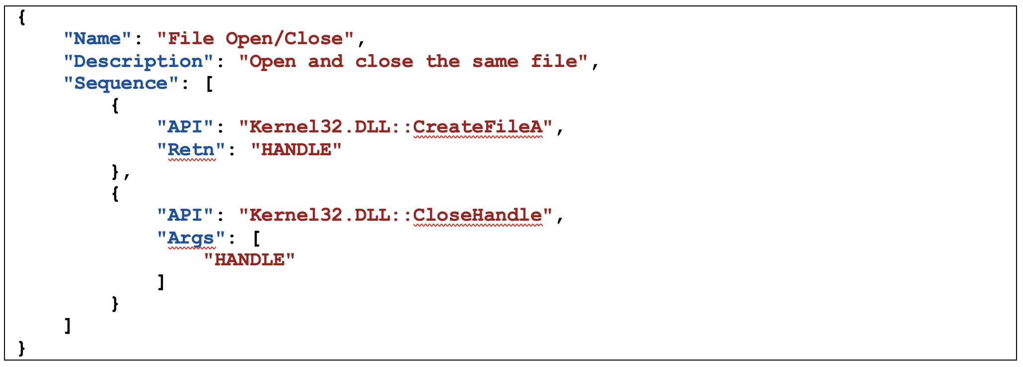The API call sequences and variables to track are specified as signatures using a JSON-based format similar to that of the Pharos ApiAnalyzer. For example, a simple signature to link the opening and closing of the same file is shown in Table 2. Note that the two functions operate on the same data: a variable labeled HANDLE. CreateFileA returns the initial value, and CloseHandle must operate on that same value for a match to exist.