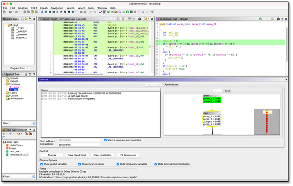 PathAnalyzer allows an analyst to determine if a path exists between two locations in a program and, if so, what values are required to take that path. PathAnalyzer integrates with Ghidra as a plugin (Figure 1). An analyst must provide start and goal addresses to seed the analysis. If a path is feasible, PathAnalyzer returns an answer in the form of a graph containing information about the recovered path.