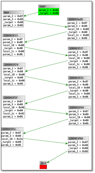 An example of a recovered path is shown in Figure 2. Each vertex in the graph represents a basic block traversed. GhiHorn operates on live variables present in each basic block, with an emphasis on variables that are linked to decompilation data structures. The variable values in the vertices are the values that Z3 selected to reach the goal address. The graph is clickable in the Ghidra user interface, meaning that selecting a node will highlight the relevant decompilation and disassembly instructions for the answer vertex.