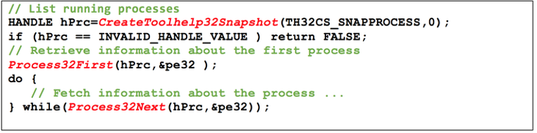 The second tool based on GhiHorn, named ApiAnalyzer, uses binary path and data flow analysis to reason about program behaviors. Like its Pharos namesake, the premise of GhiHorn ApiAnalyzer is that interesting program behaviors can be determined by finding API function call sequences that share common data. For example, Figure 3 below shows the common way to list the processes running on a system using the Windows Tool Help Functions. The API calls used are highlighted in red.