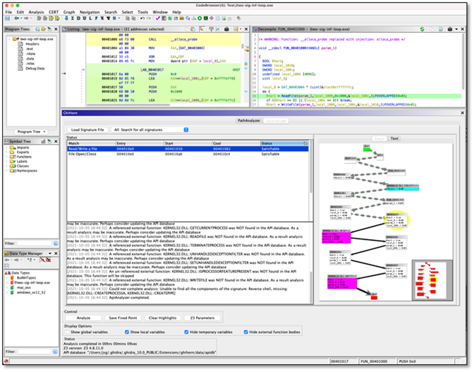 One of the more complex plugins included in Kaiju is a Satisfiability Modulo Theories (SMT)-based path analysis tool named GhiHorn. In this post we present and discuss the use of two Ghihorn tools: API Analyzer and Path Analyzer. Both of these tools enable analysts to find paths in executables based on numerous criteria, such as user-specified start and end addresses or passing through specific program points. Our previous work has shown that executable path finding can support various malware analysis activities. One example that we have previously cited is a malware program that contains a check for the presence of a debugger, a common technique meant to hinder analysis. The analyst may wish to know if there is a viable execution path that circumvents this check and, if there is a path, what inputs and environmental conditions are needed to traverse it. Both PathAnalyzer and ApiAnalyzer can be used to address and solve these types of problems.