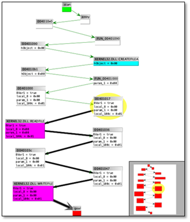 ApiAnalyzer’s answer graph is basically the same as the graph generated by PathAnalyzer. Imported API functions for which there is an implementation are highlighted in cyan. API functions for which there is no implementation are colored magenta. As before, the graph includes variable values that are used to construct the path, and the graph can be used for navigation in the Ghidra disassembly and decompiler windows.