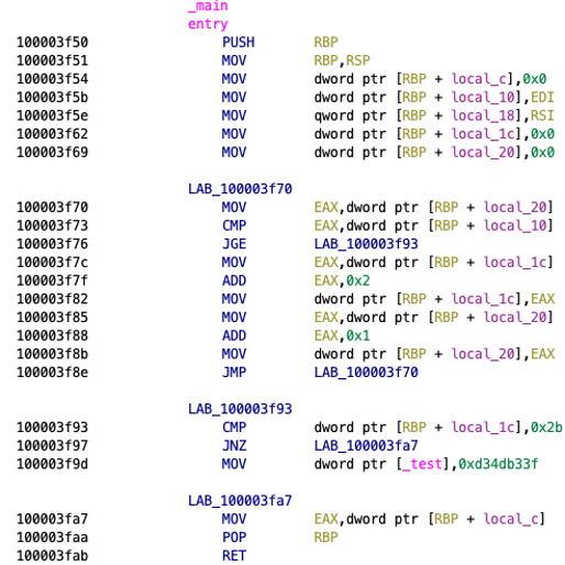 If no path is found, then a counterexample graph is generated showing how the query failed. In this version of GhiHorn the counterexample is not very meaningful. Currently, the actual results for unsatisfiable queries are presented as they are returned by Z3: as a graph with Boolean values assigned to states found in the encoding. For example, Table 1 shows the disassembly for a function. Attempting to find a path from the beginning of the function at address 0x100003f50 to the address 0x100003f9d is unsatisfiable because local_1c is always an even number, and the condition guarding the instruction at 0x100003f9d checks for an odd number. The disassembly is shown because the default result for an unsatisfiable answer is to return Boolean values (true or false) for block addresses. Aside from learning that this particular attempt to find a path is infeasible, we are still working to make counterexamples more useful.