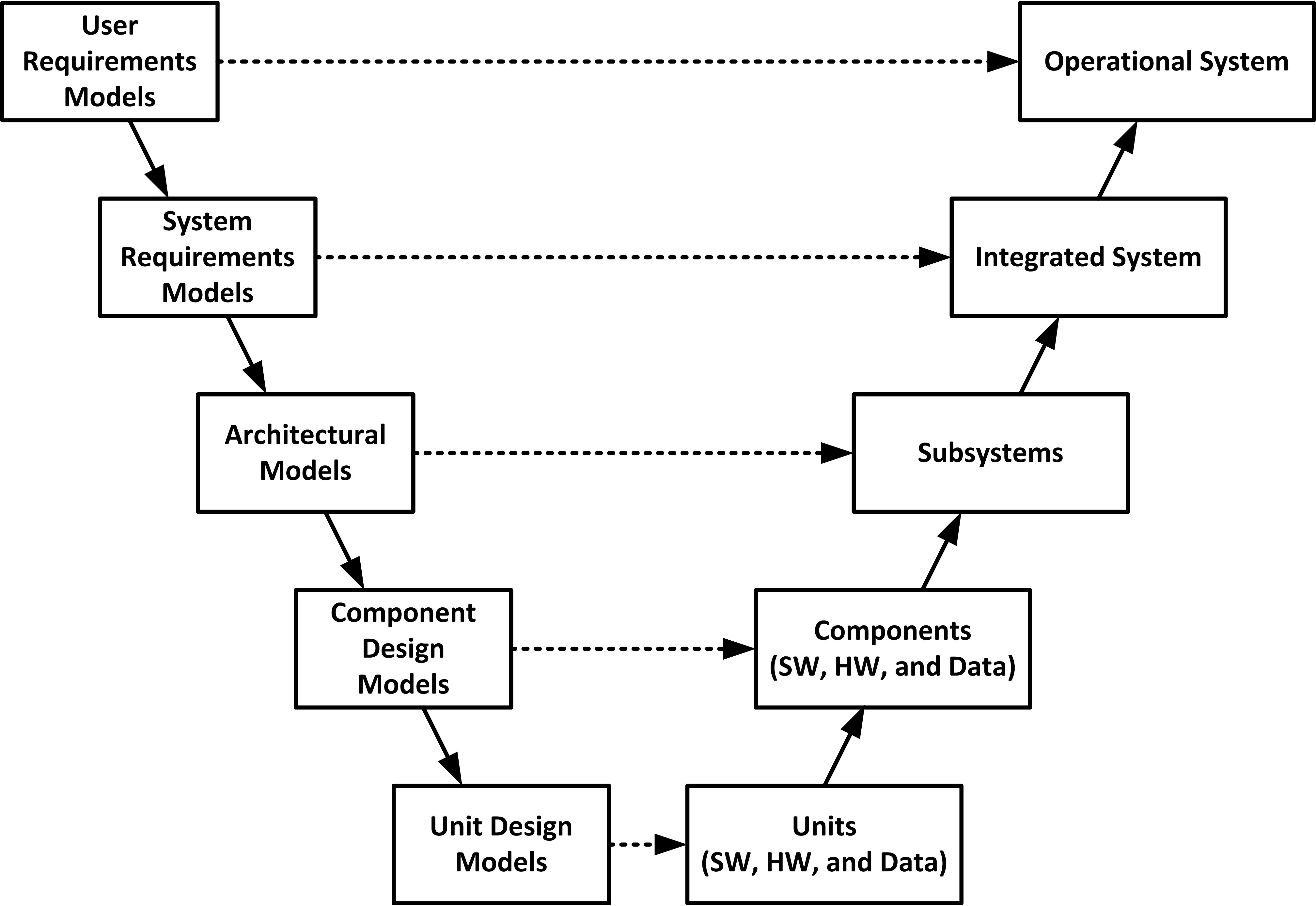 The V model is a simple variant of the traditional waterfall model of system or software development. As illustrated in Figure 1, the V model builds on the waterfall model by emphasizing verification and validation. The V model takes the bottom half of the waterfall model and bends it upward into the form of a V, so that the activities on the right verify or validate the work products of the activity on the left. More specifically, the left side of the V represents the analysis activities that decompose the users' needs into small, manageable pieces, while the right side of the V shows the corresponding synthesis activities that aggregate (and test) these pieces into a system that meets the users' needs.