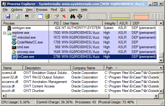 On Windows 7, the situation is a little bit better, as DEP is enabled. However, Process Explorer reports that ASLR is not enabled for the EnCase.exe process, as shown in this figure: