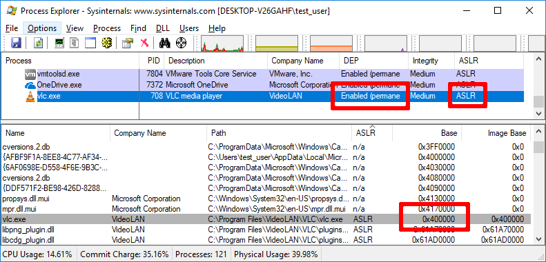 Something is quite strange here. The binary vlc.exe opts in to both DEP and ASLR, and all of its dependencies are ASLR-enabled as well. This means that there should be no predictable code locations for an attacker to leverage in a ROP exploit. But notice that the base address for vlc.exe is 0x00400000, which is a special address in the world of Microsoft Windows. This address is an indicator that a process has not been loaded at an address that has been randomized by ASLR. Why is Process Explorer reporting that VLC is using ASLR, but it is also loading at a non-randomized address?