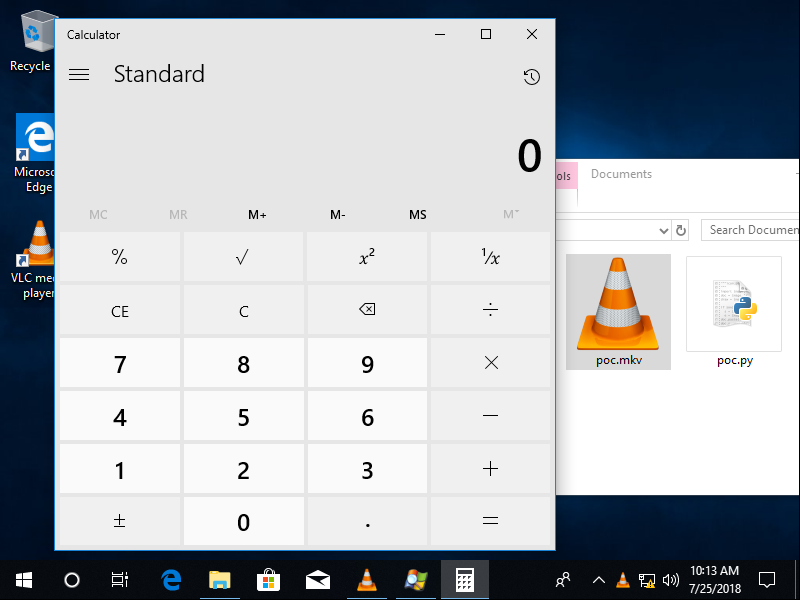 Earlier this month, a PoC exploit for VLC 2.2.8 was posted to Exploit Database. This exploit was tagged as "E-DB Verified," which indicates that the exploit was confirmed to be functional. I tested out the exploit in a fully-patched 64-bit Windows 10 virtual machine that was connected to a CERT Tapioca Wildcard VM for network connectivity (since I don't fully trust what the exploit claims to do). Sure enough, opening the MKV file resulted in calc.exe popping, as shown in this figure: