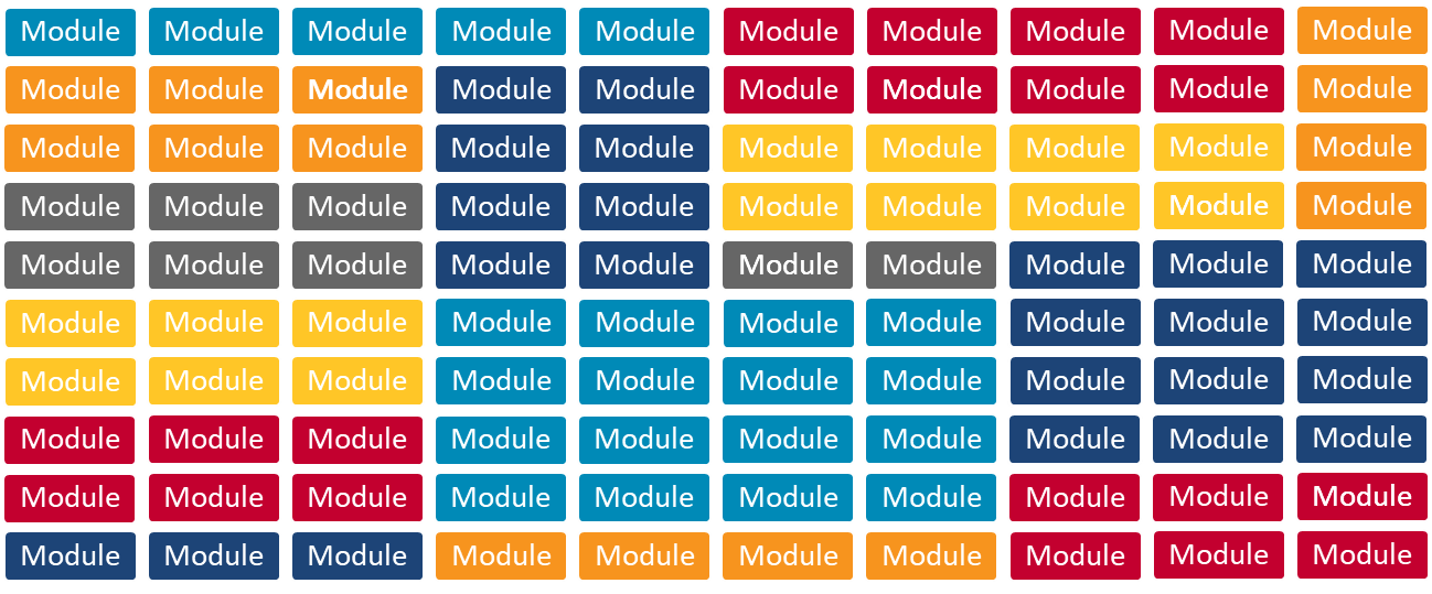When combining multiple systems into a unified system, the data objects, data actions, and jobs to perform for each individual system must be identified. All these components are implemented as modules within the codebase with one or more modules representing each data object, data action, and job to perform. These modules should be grouped into categories for working with later steps. This grouping is indicated by color coding in Figure 1.
