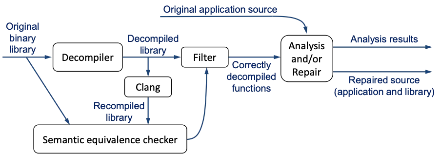 Our work will evaluate the feasibility of decompiling binary libraries to enable static analysis and localized repairs to functions of a binary library or binary executable. More specifically, we aim to