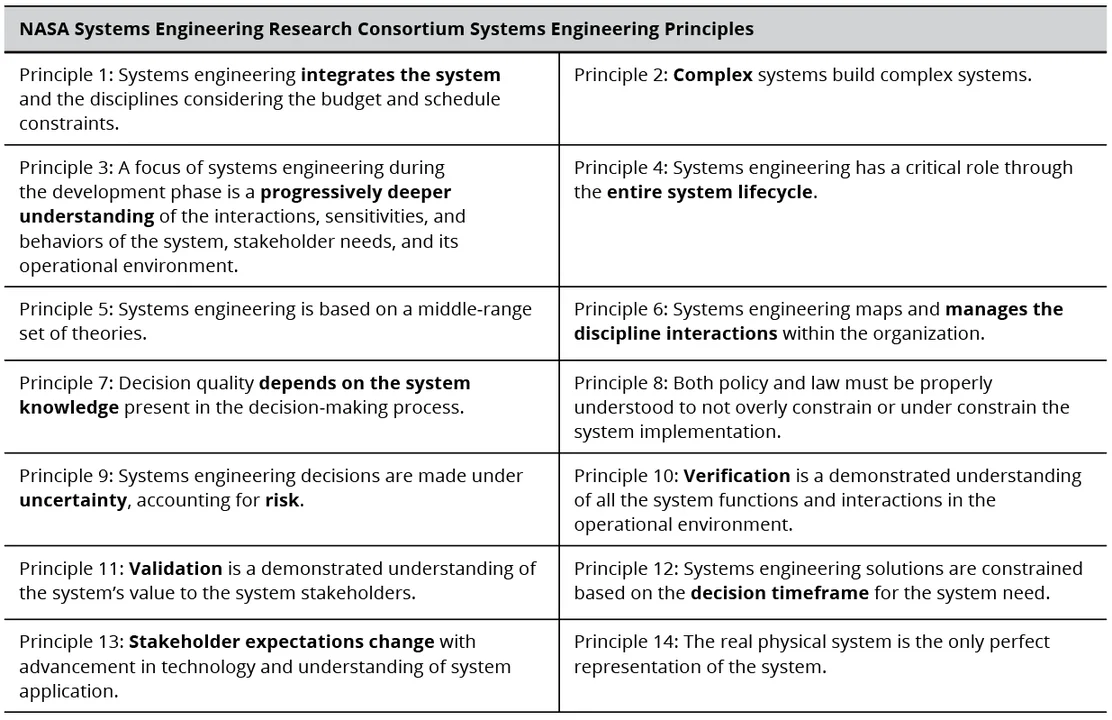 Systems engineering principles have generally not been as visible as those for DevSecOps. Earlier lists have recently been revisited by the NASA Systems Engineering Research Consortium to address some of the differences identified in Table 1, but the adoption of these refined principles by practitioners is unknown. The principles are somewhat generic because they must apply across so many domains. Table 3 below illustrates the 14 NASA principles (I've highlighted some of the key concepts for this post).