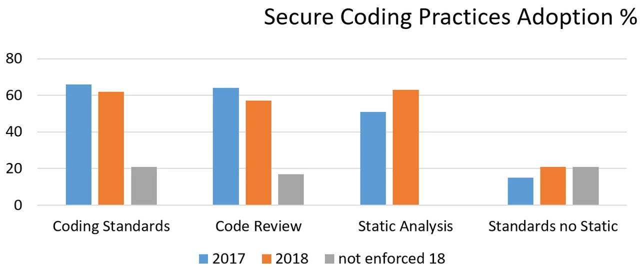 The disparity between the use of standards, such as the SEI CERT Coding rules, and the use of static analysis tools to identify violations of coding rules is illustrated by data from the Barr Group Embedded Security Safety Report from 2017 and 2018 (see Figure 1 below).