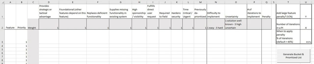 - Optional: size penalty. A later addition to the tool was a prioritization penalty applied when a feature was too large. By enabling this penalty, the team encouraged smaller features in the backlog. This had the added benefit of more features that do not continue into the next program increment. If you do not wish to use this feature, skip this step.