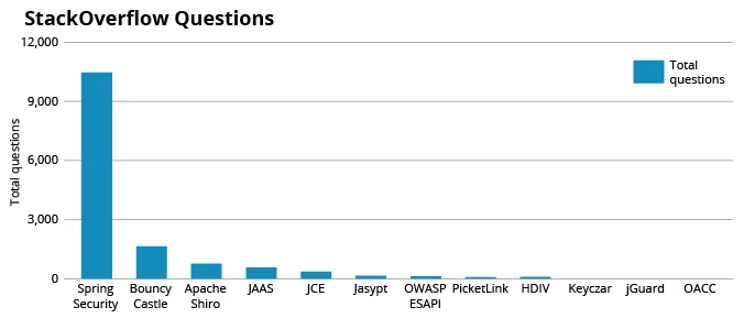 We extracted data, based on search results from Stack Overflow, to quantify the security frameworks' popularity. Figure 4 below shows the overall results for the popularity criterion.