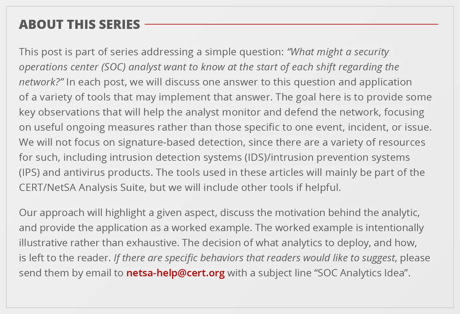 Logs, either from clients, servers, or security devices, such as firewalls, could contain records of update contacts. Again, however, a time-consuming process would be needed to filter, federate, and aggregate the logs before processing them to identify the summary information. This blog describes use of network flow records (which summarize network connections) and applying them in a retrospective analysis (via the SiLK tool suite), streaming analysis (via Analysis Pipeline), and through an SQL database.