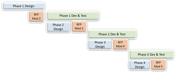 One idea is to stagger the design and development efforts by contracting for the development and test for the current phase in the same contract action as the design for the next phase. The pattern looks something like the figure below: