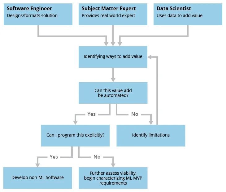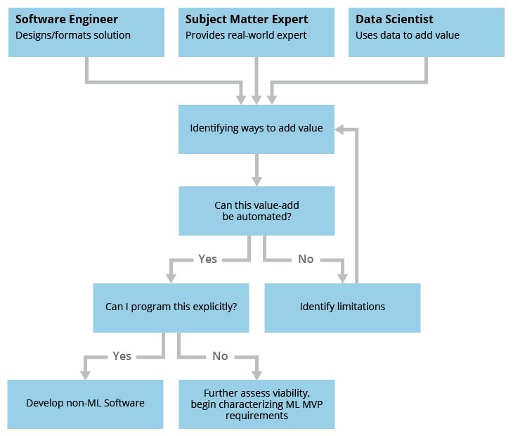 After settling on an area for improvement for the business need, the team works to scope the problem and develop requirements by asking "What's the minimum we need for the capability to actually be useful?" Part of this scoping process should consider whether an ML solution is even appropriate for the problem. These requirements characterize the minimal viable product or MVP. The role of the data scientist in this process is then to convert business requirements into quantitative ML system requirements/metrics.