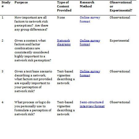 In this research effort, context is operationally defined as description of an organization's network at a particular point in time. We hope to identify factors that are consistently important for low-, medium-, and high-risk perceptions.
