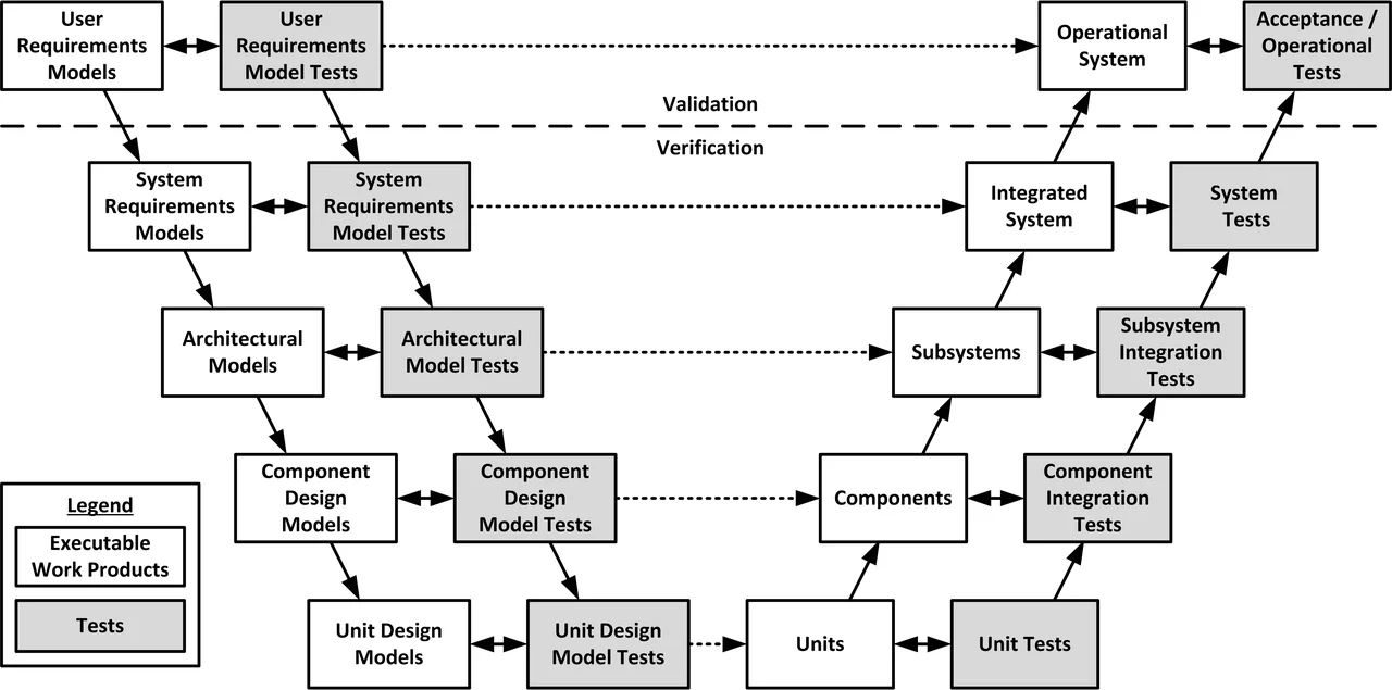 In the double V model, every executable work product should be tested. Testing need not--and in fact should not--be restricted to the implemented system and its parts. It is also important to test any executable requirements, architecture, and design so that the defects in the models are found and fixed before they can migrate to the actual system and its parts. This process typically involves testing an executable requirements, architecture, or design model (or possibly a prototype) that